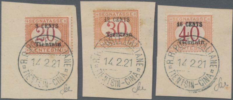1918, dues 8 C./20 C., 12 C./30 C. and 16 C./40 C. tied "R.R.POSTE ITALIANE / TIENTSIN-CHINA 14.2.21" to three pieces, cert. Cilio (2020), Michel €505.-