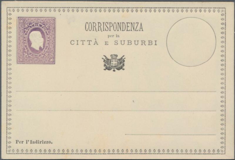 1872 (ca.), Essay Postal Card "CORRISPONDENZA per la CITTA e SUBURBI", (Giuseppe Re), size 11,6:7,7 cm, with undenominated value field "Vitt.Emanuele" in violet at left. Rare and attractive!