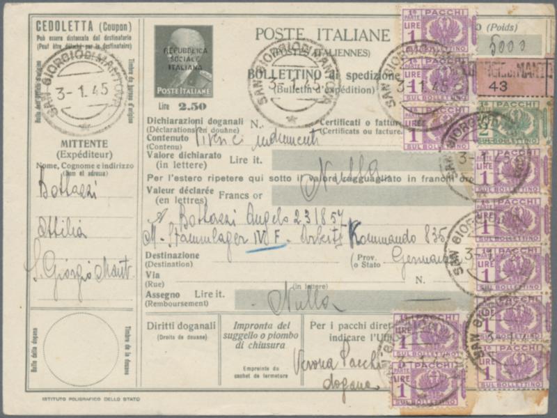 1945, Parcel despatch form 2.50lire grey used from "SAN GIORGIO DI MANTOVA 3.1.45" to camp address in Germany, usual slight postal wear, fine.