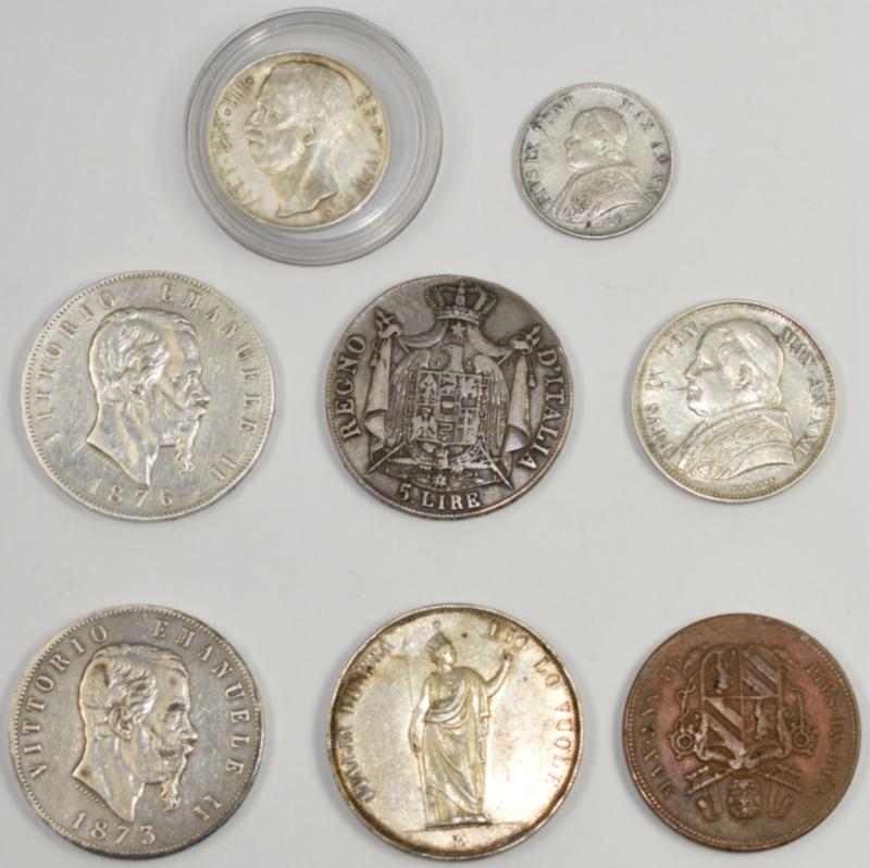 Lot 8 Münzen; Königreich 5 Lire 1808 M, Lombardei provisorische Regierung 5 Lire 1848, Königreich 5 Lire 1873, 1876 und 10 Lire 1927, Kirchenstaat 201/2 Lire 1867, 1 Lira 1866 und 2 Baiocchi 1850.