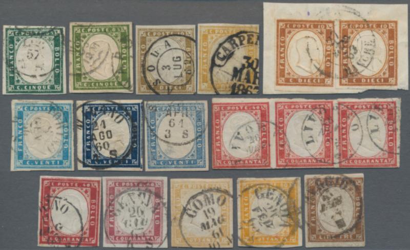 1852/1859, interesting selection of 20 used stamps, comprising first and second issue with all main catalogue numbers (Sass.#1-11) complete incl. various colors and types, furthermore newspaper stamp 6 C rose (Sass.#1) and Provisional Governmen