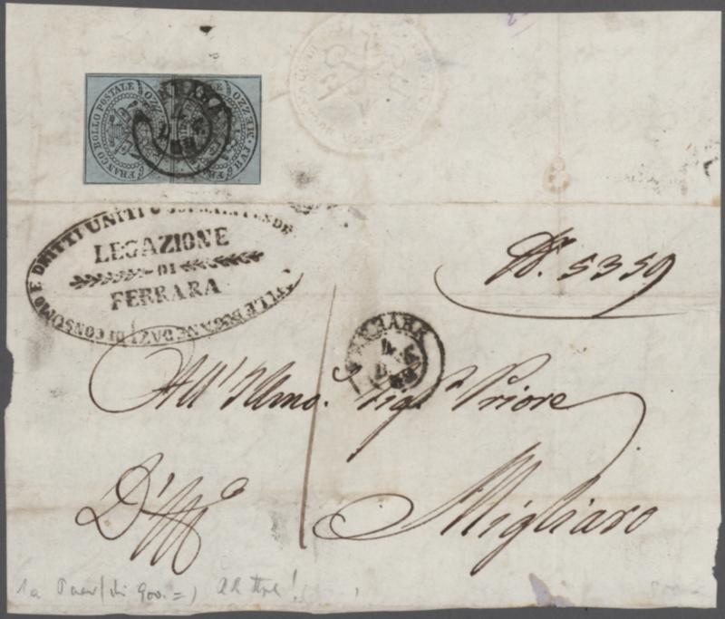 1852, 15 c black on rose, touched at right, but extra large margins at all other sides with parts of 4 other stamps tied to cover addressed to Carpineti with Reggio 1 LUG 58 transit on reverse. in addition single stamps and pieces e.g. a 40 c s