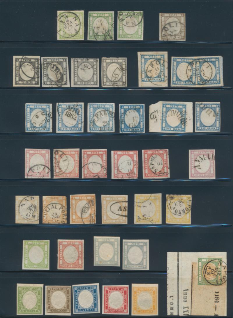 1861/1862, PROVINCE NAPOLETANE, collection with ca.40 stamps and four franked letters, comprising valuable used items, i.a. ½ t green (Sass.#17, 4 examples incl. one fragment), ½ gr brown (Sass.#18), 5 gr (Sass.#21, 6 examples in various colors), 10 gr (Sass.#2