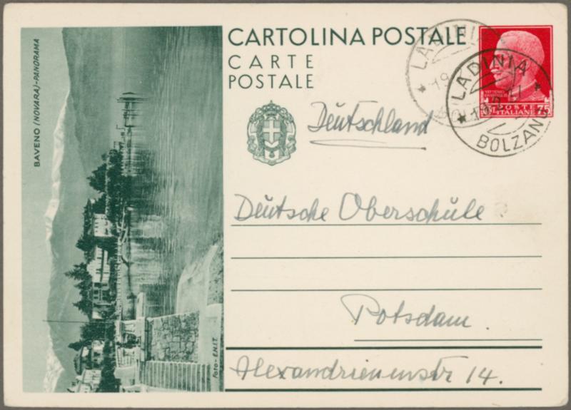 1943/1944 Album with 11 complete sheets of RSI overprints (e.g.1,25 green Espresso with a clear offset ("decalco"). In addition several hundred "bollettini" from the republic (1954- 1990 ca) announcing new stamps be depicting and describing them. An unusual off