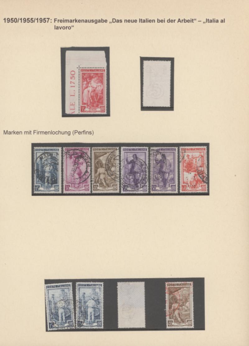 1950/1957: "Italia al lavoro" - "Italy at Work", the Italian definitves series designed by Corado Mezzana which represents the spirit of the "New Italy" after world war 2 and the founding of the republic. Different watermarks, printing varieties, perfins are pr