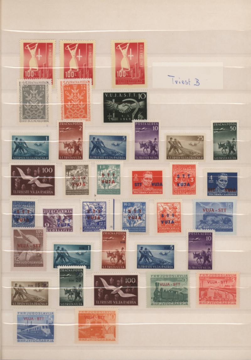 1945/1955 (ca), stock book with a mint never hinged collection Triest Zone B, including Block 1 A/B and Block 2the mandatory tax stamps, and the postage dues. A page with Italian occupation of Montenegro and another page of "ISTRA" overprints on Ital