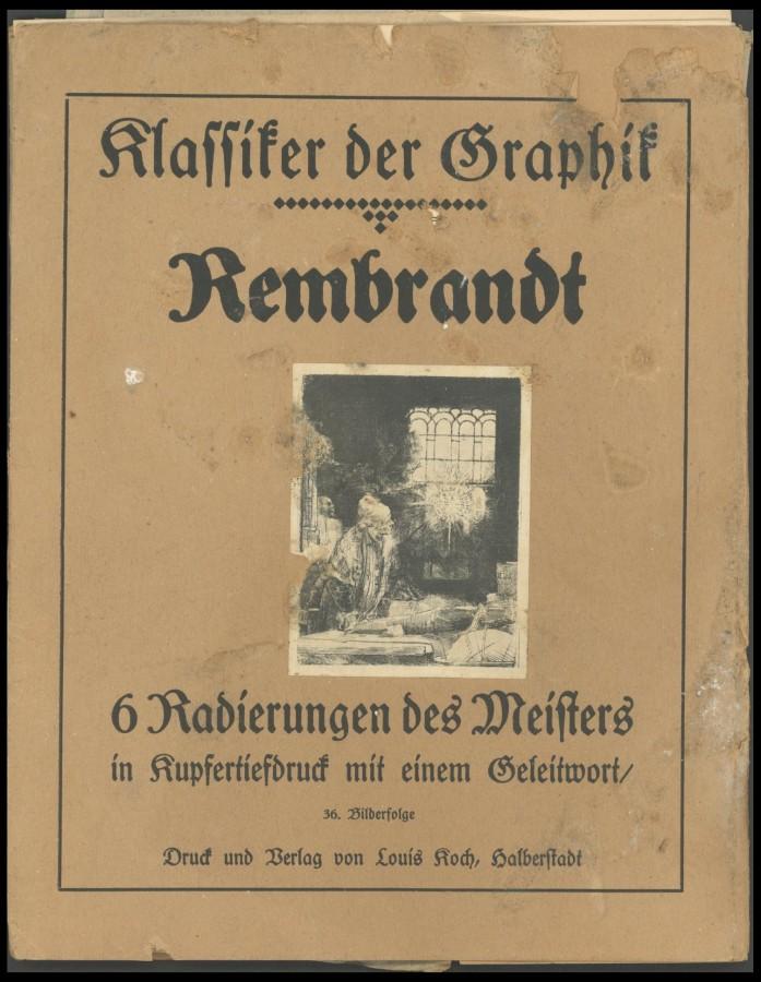 classic the graphics. REMBRANDT, 6 etchings of the master in rotogravure with a foreword, 36. Picture success printing and publishing house Louis Koch, pockets book. condition age-appropriate: portfolio discoloured and damaged. image panel partly stained. year of publication approximate 1925