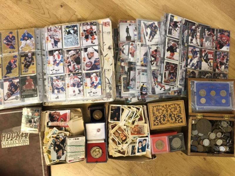 Sweden, Box with e.g. 100s of Hockey trading cards, coins, stamps, six Lindner Falzlos albums with leaves + supplements Austria, Monaco and Switzerland, etc. Approx. 40 kg. 1 more image is available at www.philea.se.