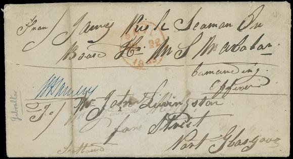 GIBRALTAR STAMPLESS COVER TO SCOTLAND - Folded letter datelined Gibraltar Nov. 12, 1843 from a seaman on board the naval ship 'Malabar', mailed to Port Glasgow in Scotland entering the mails In England with red Nov. 22 PAID postmark in red, clear boxed Port Glasgow Nov. 23 receiver backstamp, a ni