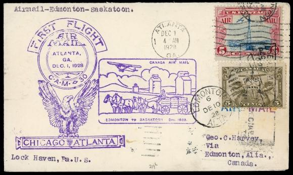 CANADA - UNITED STATES FLIGHT COVERS - Sixteen different first flight covers December 1, 1928, each franked with Canada's first airmail (#C1) and a U.S.A. 5¢ carmine and blue (#C11), all are western Canadian routes from/to Calgary, Edmonton, Regina, Winnipeg and Saskatoon, then to Chicago, Atlanta a