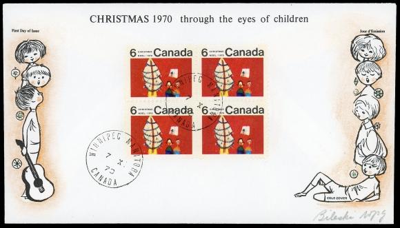 CANADA 1970 FIRST DAY COVERS - 1970 Christmas Issue, 5¢ and 6¢ Centre Blocks of four both Tagged and Untagged on four unaddressed First Day Covers, prepared by K. Bileski with clear Winnipeg postmarks, VF, cat. $500.00 VF