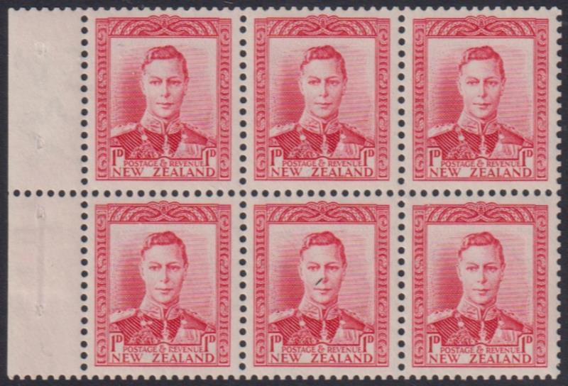 1938 1d GVI red pane of 6 with "5" in selvedge. CP W6aZ. Cat $130. Mint.