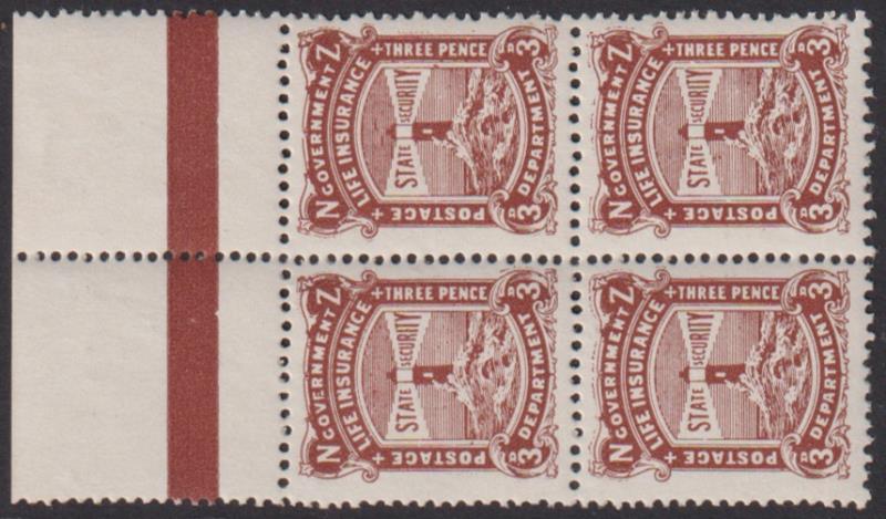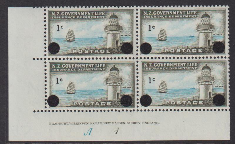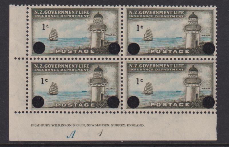 1967 1c on 1d Taiaroa plate block of 4, white paper. CP cat $80. MUH.