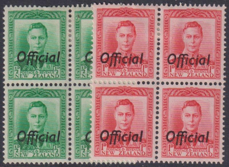 1938 ½d GVI green & 1d red blocks of 4, bottom 2 stamps unhinged. Jury cat $160. Mint.