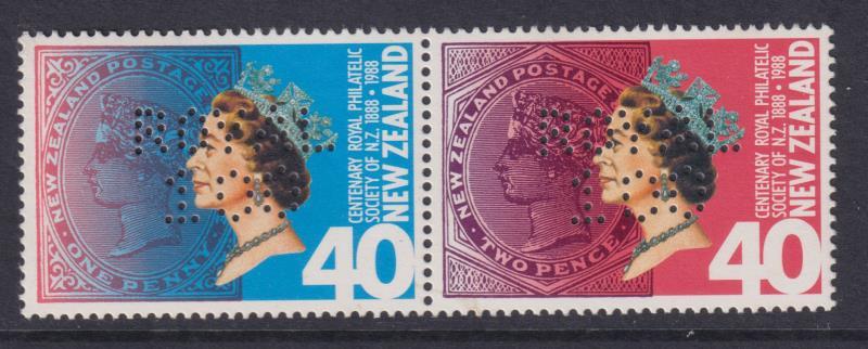 Perfin: 1988 Royal 100 40c RPSNZ cent horiz setenant pair. MUH.