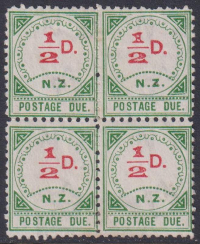 1899 ½d Postage Due large "N.Z." variety: "white colon" in "1" of "½", right pane R3/4 in block of 4. CP Y1a, Y1a var. Cat $340. MNG.