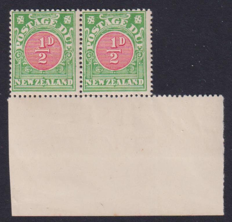1899 ½d Postage Due (large "N.Z.") horiz pair error: red colour offset misplaced 3mm upward, with interpanneau selvedge at left, 1st stamp 1 pulled corner perf. Variety unlisted by CP. Ex Jim Shaw. CP Y2a, Y2a var. MNG.