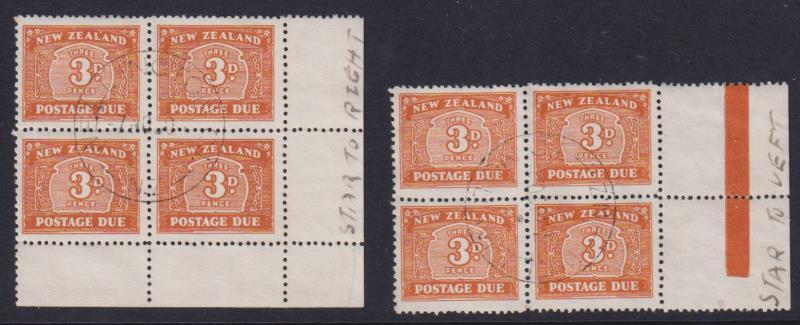 1945-9 3d Postage Due selvedge blocks of 4, multiple sideways & sideways invtd wmks. Both with central Wellington cds 7 NO 50. CP cat $160. VFU/CTO.