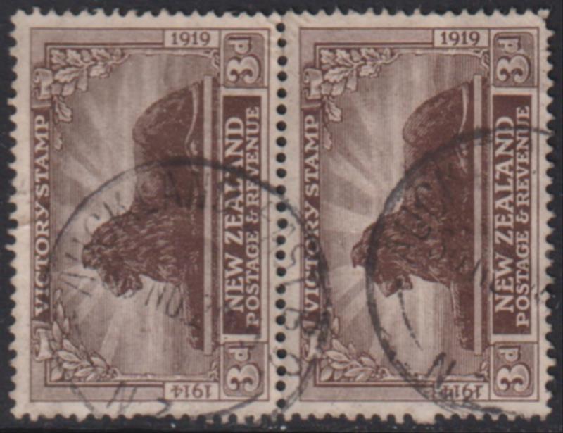 Auckland East BO (AK 1913-23) very fine 30 NO 20 "J" class cancel (x 2) on vert pair 3d Victory. Wooders 5.