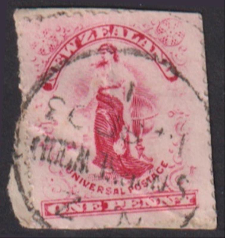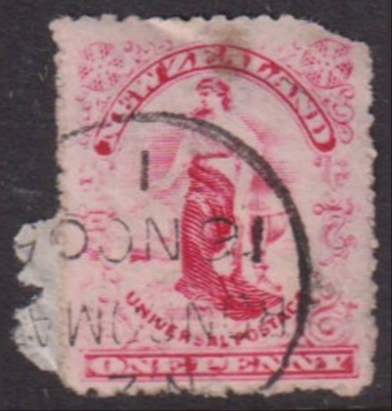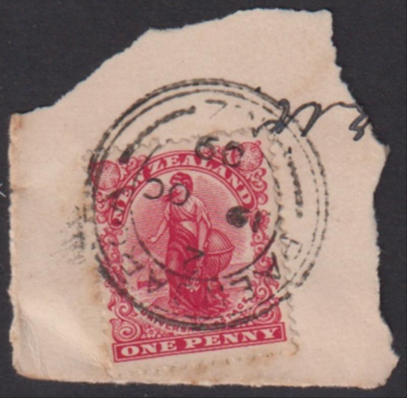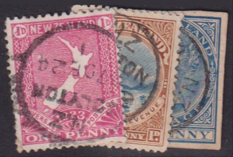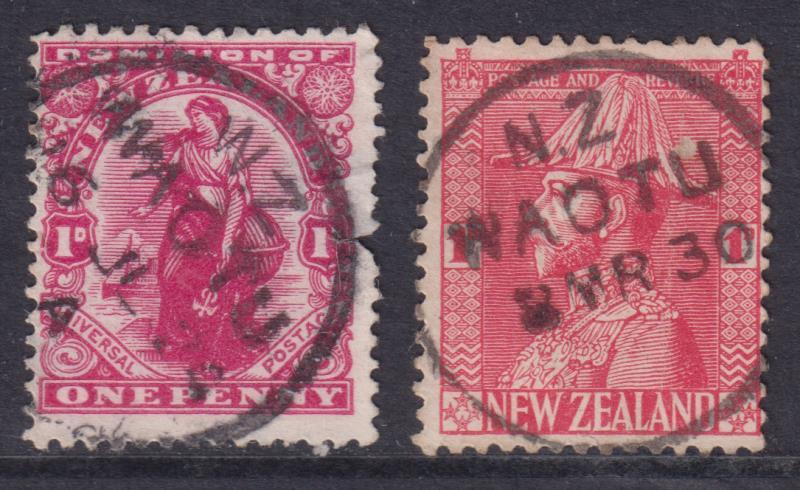 Port Ahuriri (NA 1869-1953) 2 diff "C" class cancels on 1d Dominion & 1d Field Marshal (latter on piece). Both Wooders 3.