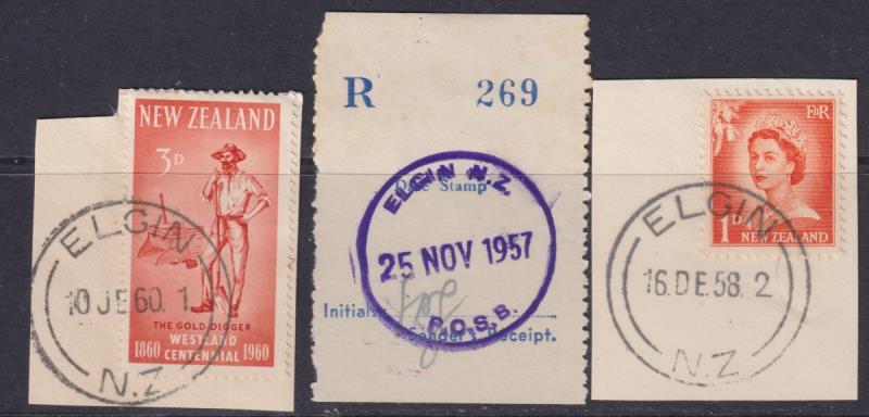 Elgin (GS 1957-c1992) two fine strikes of J-type cds 16 DE 58, 10 JE 60. Also fine complete P.O.S.B. rubber cds 25 NOV 1957 (in violet) on regn label (3).