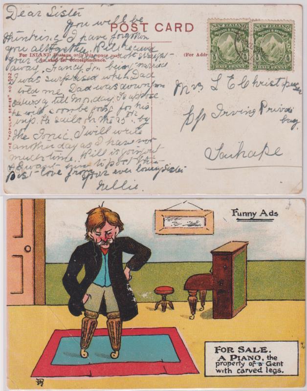 Lochiel (IN 1880-1975) good/fine near complete A-type cds (2nd type) 18 MR 12 on 1d Dominion on Bamforth & Co comic PPC. With near complete but only fair Kereru (NA 1862-1919) A-type cds 22 MR 12 as receipt d/s. Minor edge/corner wear.