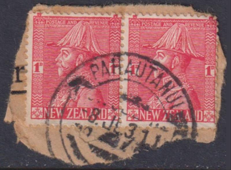 Pahautanui (WN 1861-1951) good 8 JL 31 "J" on pair 1d Field Marshal, on piece. Wooders 4.