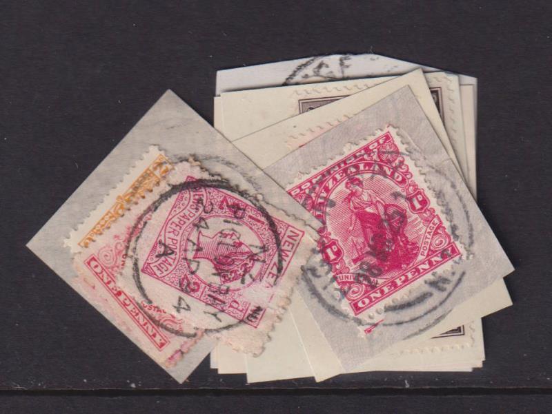 Pigeon Bay (CH 1880-1988) 9 fine cds pmks (complete or almost complete) on stamp (3) or piece (6), incl A-type x 4 1894-1921, J-type x 5 1925-1987. Excellent range of dates, Banks Peninsula office.