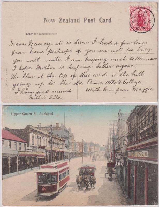 Pokeno Valley (AK 1879-1926) good complete A-type cds (name complete but light) 7 MY 09 on 1d Universal surface printed on attractive view PPC publ "W&A" ("Upper Queen St, Auckland") with tram & horse-drawn wagon in foreground. Small corner crease, other
