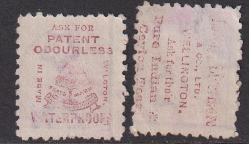 Ngaruawahia (HN 1878-, earlier Newcastle), 2 good/fine examples of "A/39" barred obliterator with reversed "9" error, c1893 on 2 x 1d SSF p10, both with brown advts ("Creases Dandelion Coffee ..." & "Cadbury Bros.") Scarce marking.