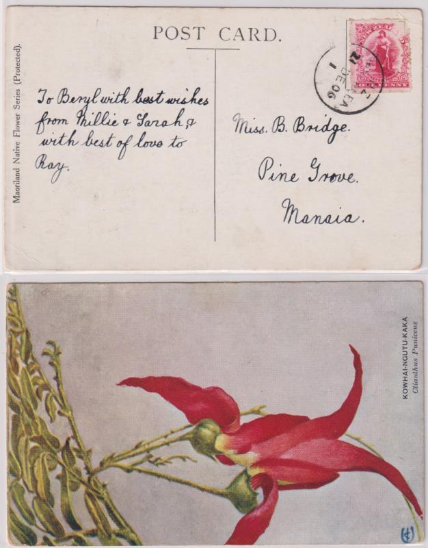 Riverlea (NU 1899-1970) good near complete A-type cds 21 DE 06 (some letters of name partial) on 1d Universal (corner damage) on fine NZ art PPC ("Kowhai-Ngutu-Kaka" ex "Maoriland Native Flower Series").