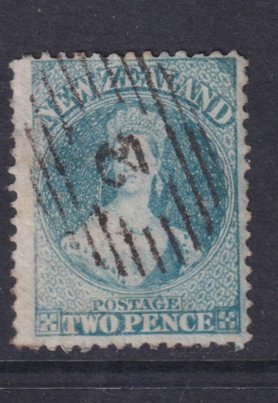 Wanganui (Petre) fine (sharp impression) near complete "12" in bars Perkins Bacon obliterator on FFQ 2d pale blue, no wmk, imperf 3-4 margins (SG 9, cat £180). Extensive thins on back, frontally fine.