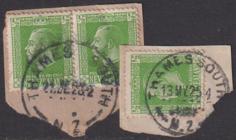 Thames South (TH 1915-38) good/fine fairly complete strikes of 2 diff cds on ½d GV on pieces: 13 MY 25 (25mm cds) & 21 JE 28 (29mm only).