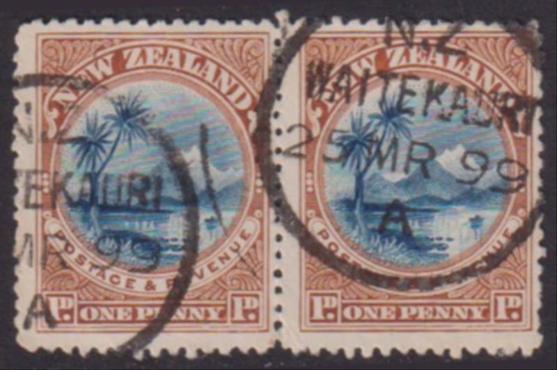 Waitekauri (TH 1876-1946) fine near complete A-type cds (& another part strike) 25 MR 99 on horiz pair 1898 1d Taupo. Goldmining.