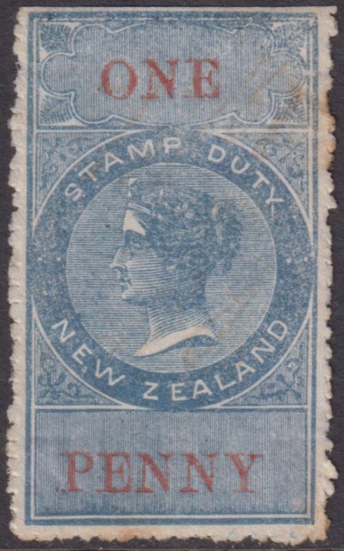 1867 1d QVLT bluish-grey & red, die I, large NZ (16 x 6mm) wmk, serrate about 13 on 3 sides. Faint perf tone, cleaned pen cancel. Kiwi R259e. Cat $750.