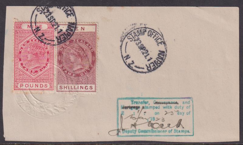 1921 £9 & 10/- QVLTs embossed, but unpunched on piece with boxed green h/s: "Transfer, Conveyance and Mortgage stamped with duty of 1/- on 23 Sep 1923 (& signed) Deputy Commission of Stamps". Kiwi R460, R480.