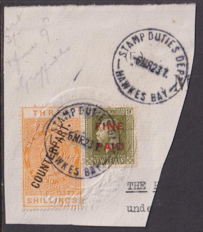 1923 COUNTERPART 3/- QV together with 9d GV FINE PAID both embossed, but unpunched on piece with pencil annotation " ?/ 3/-/ + fine 9d / Griffiths''. Kiwi R65b. Cat $20.