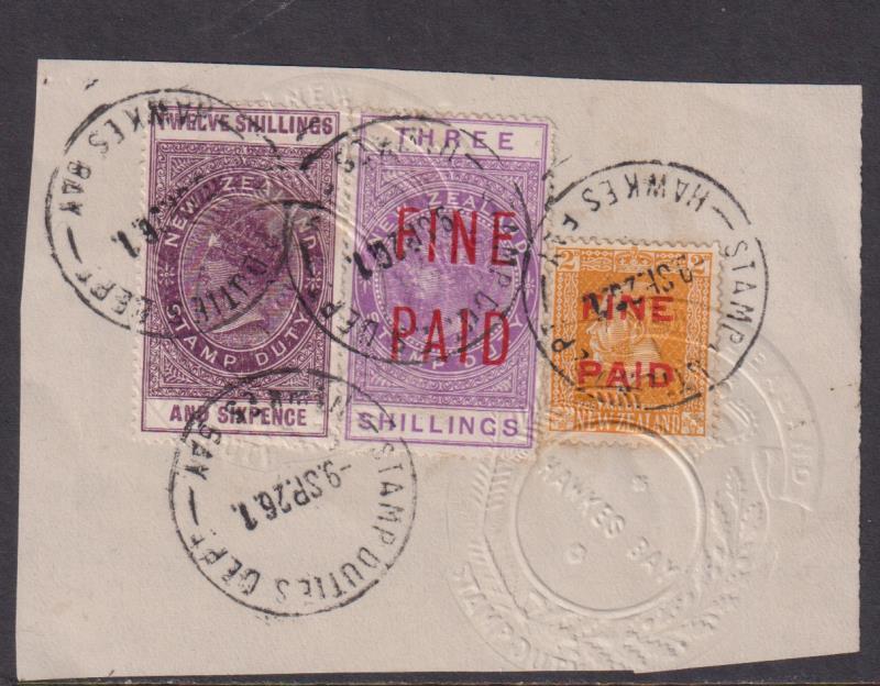 1926 12/6d QVLT on piece together with 3/- QVLT FINE PAID & 2d GV FINE PAID, ex Hawkes Bay 9 Sept. All are unpunched but are embossed. Kiwi R60a, R70 & R461. Cat $255.