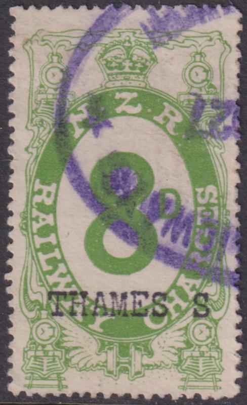 1925 8d Railway Charges yellow-green, ovpt "Thames S'', p14½ x 14, purple oval rubber cancel. Kiwi RN17D. Cat $75.