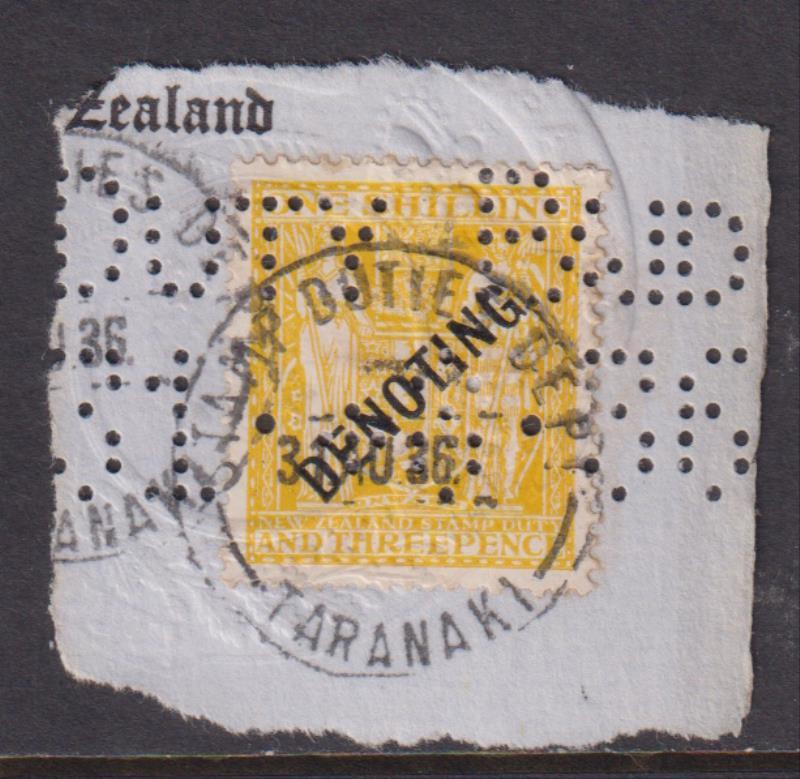 1931 1/3d Arms lemon, DENOTING, punched on piece. Kiwi R52. Cat $75.