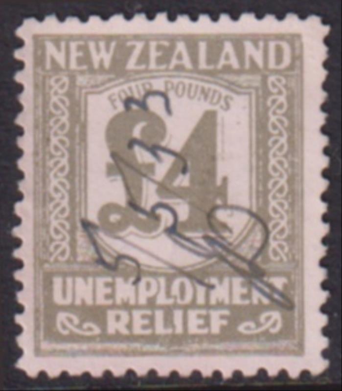 1931 £4 Unemployment Relief olive-grey Wages Tax stamp. Kiwi R593. Cat $120. FU.