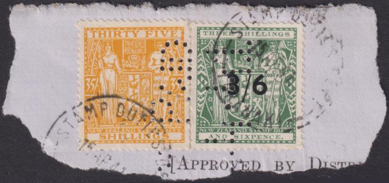 1940 35/- Arms & 3/6 on 3/6d punched on piece, 14 April 1941 cds. Scarce thus, as most 35/- Arms stamps seen punched are with large single holes. Kiwi R523F. Cat $600.