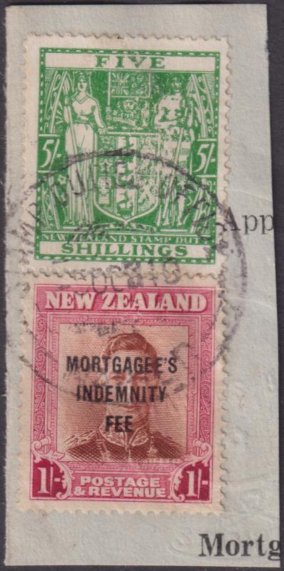 1947 MORTAGEE'S INDEMNITY FUND 1/- GVI, upright wmk unpunched on piece with 5/- Arms. Kiwi R164a. Cat $50.