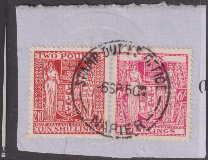 1950 £2/10/- Arms, plus 6/- Arms both unpunched & on piece . 1 Stamp duty Napier pmk. Cat $50+.