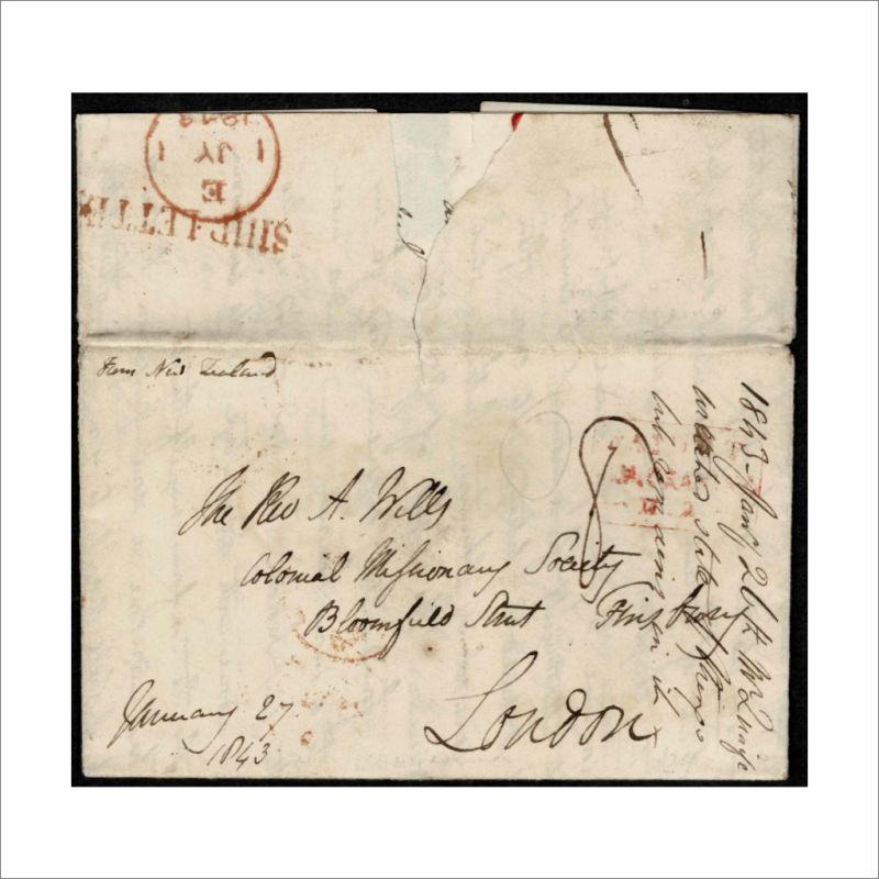 1843 (JA26) Entire written by B Quaife to Rev A Willy,Colonial Missionary Society, London with fair ‘PAID AT/KORORAREKA’ Red handstamp. On the back has a straight-line SHIP LETTER cancel and 1 JY 1843 London cancel. Very Scarce (1)
