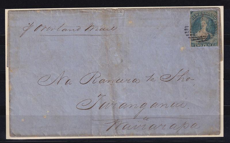 1863 2d Milky Blue SG 37a tied by indistinct obliterator endorsed ‘Per overland Mail’. Has Maori notation translates - Here is the money for the sale of the mill on 4 September 1863. No backstamps. The cover a bit aged. (1)
