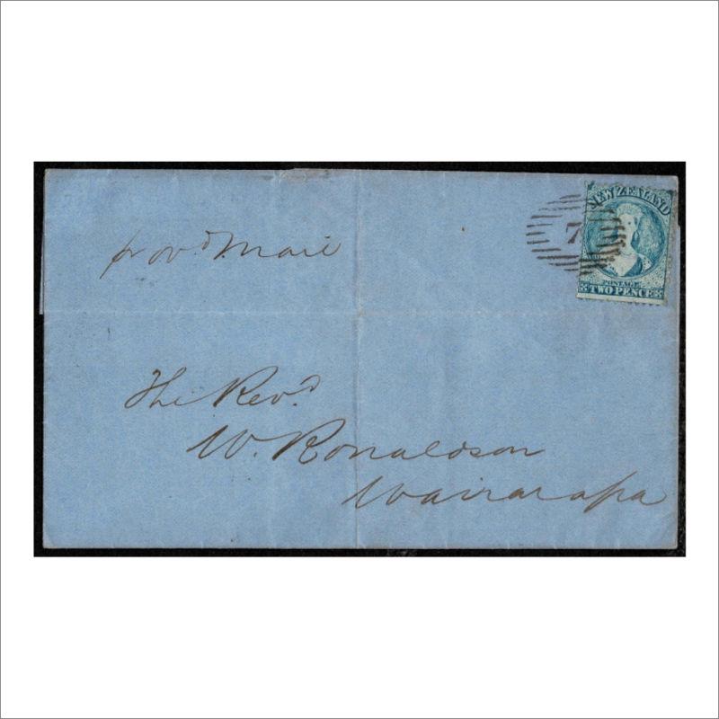 1864 (DE31) Outer Blue Wrapper endorsed ‘Per Mari’ with 2d Blue Perforated Full Face Queen tied by Perkins Bacon ‘7’ (Wellington) cancel addressed to ‘The Rev W Ronaldson,Wairarapa’. Has ‘Bethune & Hunter Merchants/Wellington NZ’ green label on the back. Backstamped Wellington. The wrapper has light