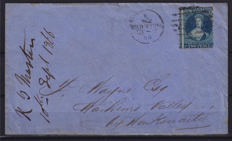1865 (SE7) Local Printed Cover (B Martin.Dunedin) with Perforated 2d Blue tied by Dunedin duplex cancel to Waihemo Valley,Waikouaiti. On the back has a manuscript ‘W 12/9/65’ receiving cancel. (1)