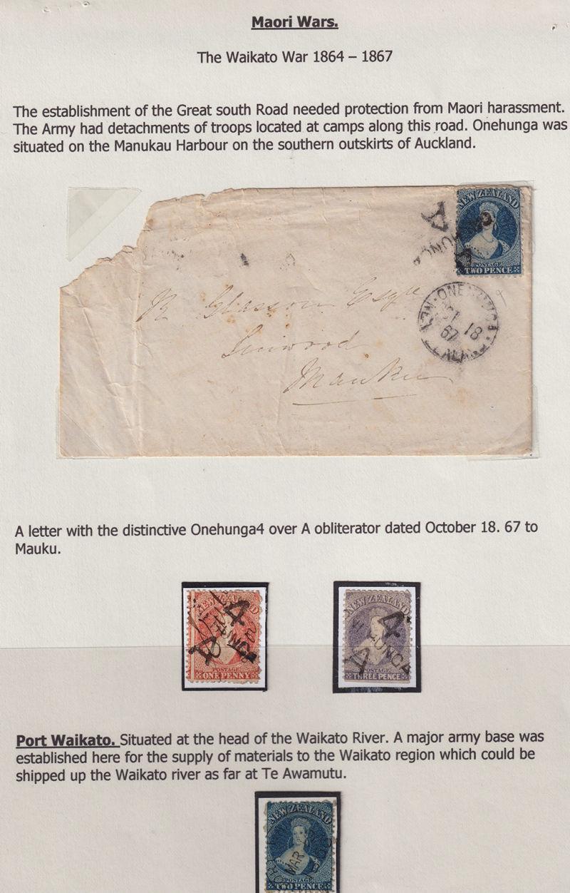 1867 (OC18) Cover with 2d Blue Perforated FFQ tied by 4/ONEHUNGA/4 cancel plus Onehunga/New Zealand cancel Ex Innoue with RPSNZ 1996 Certificate. Also 1d Orange & 3d Lilac both with ‘4/ONEHUNGA/4’ cacnels plus 2d Blue Perforated with light Port Waikato cancels. Maori War Period cancels. The cover ha