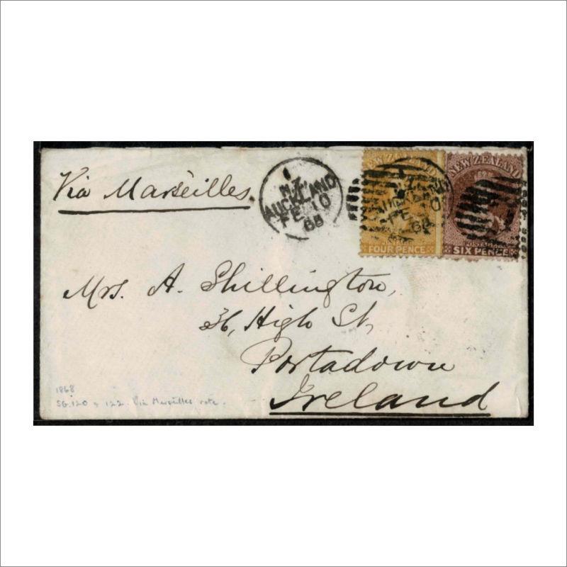 1868 (FE10) Cover endorsed ‘Via Marseilles’ to Ireland with 4d Yellow & 6d Red-Brown tied by overinked Auckland duplex cancel. Ex Odenweller. (1)